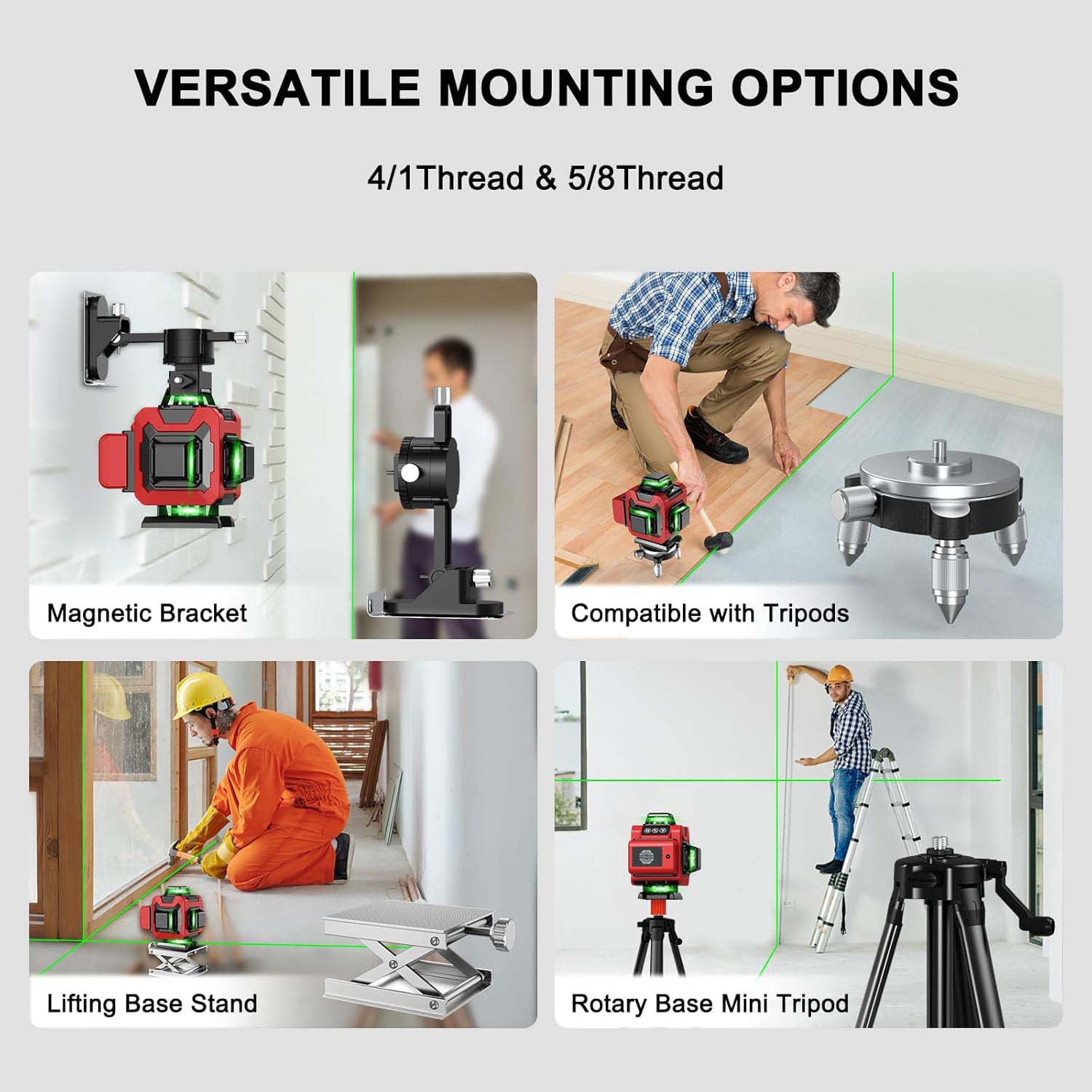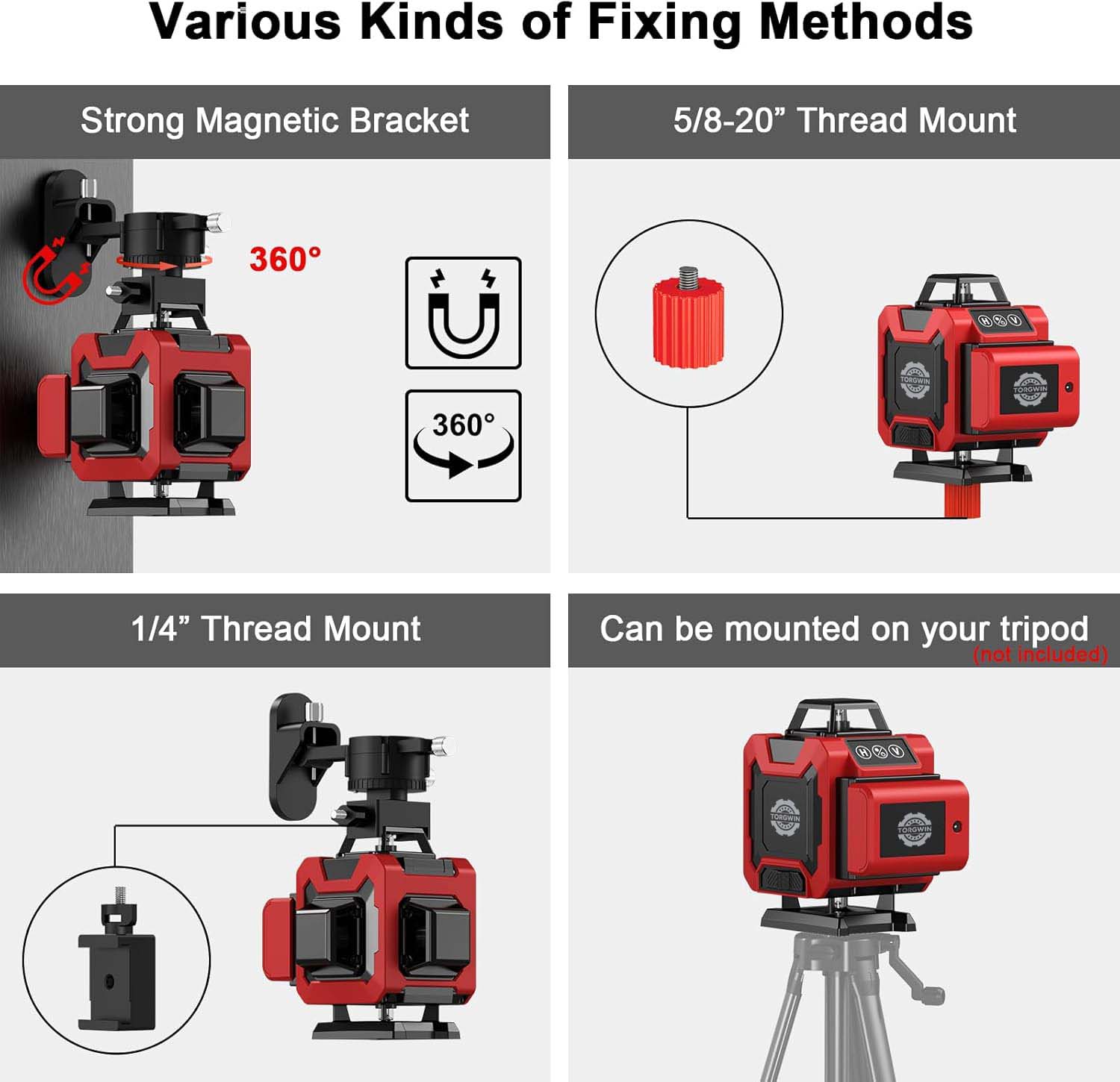 1. विविध फिक्सिङ विधिहरू:यो एक बलियो चुम्बकीय कोष्ठक संग सुसज्जित छ, जसले धेरै परिस्थितिहरूमा लेजर स्तर फिक्स गर्न एक स्थिर र सुविधाजनक तरीका प्रदान गर्दछ। 5/8 - 20" थ्रेड माउन्टले यस प्रकारको थ्रेडको साथ विशिष्ट उपकरण वा संरचनाहरूमा जडान गर्न अनुमति दिन्छ। 1/4" थ्रेड माउन्टले माउन्टको लागि अर्को विकल्प पनि प्रदान गर्दछ, यसको विभिन्न सामानहरू बढाउँदै।